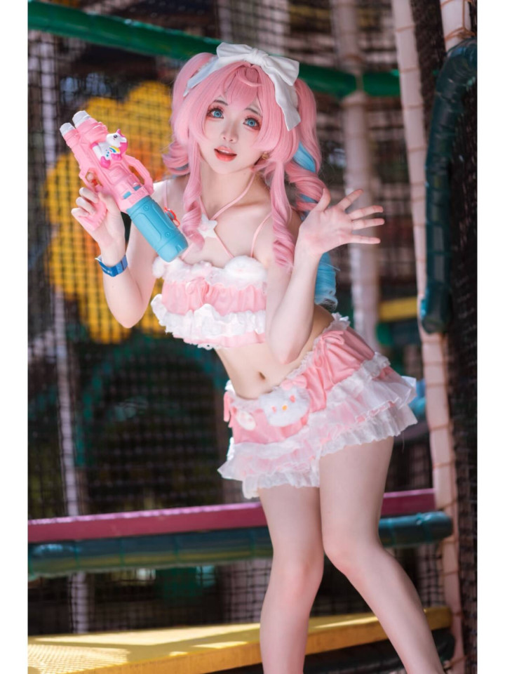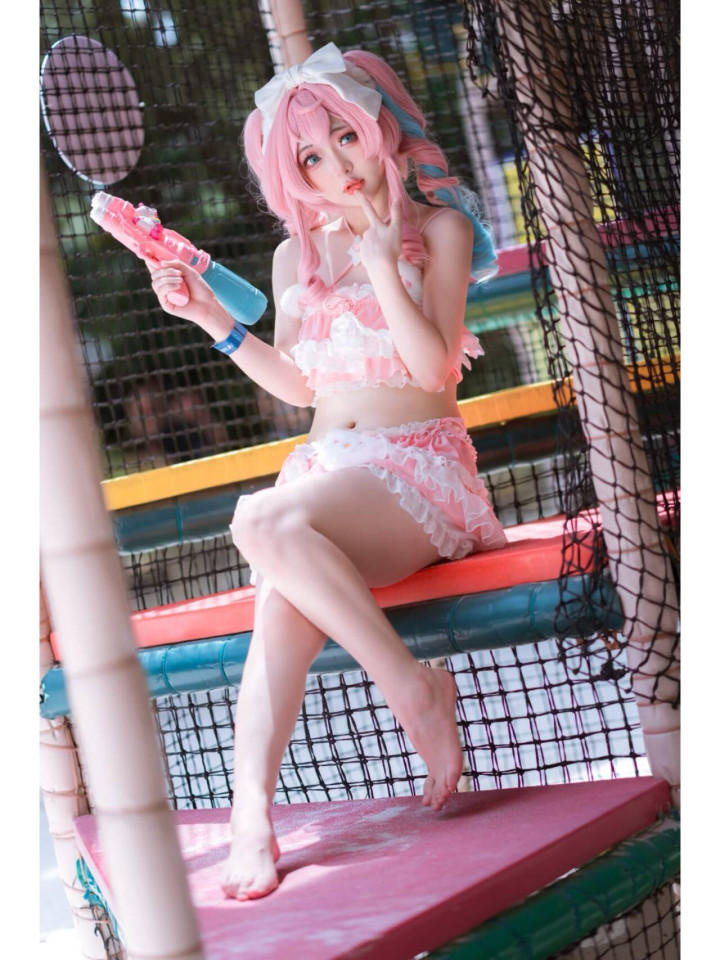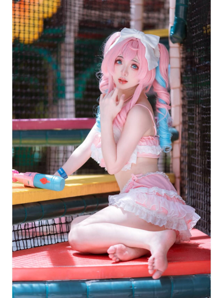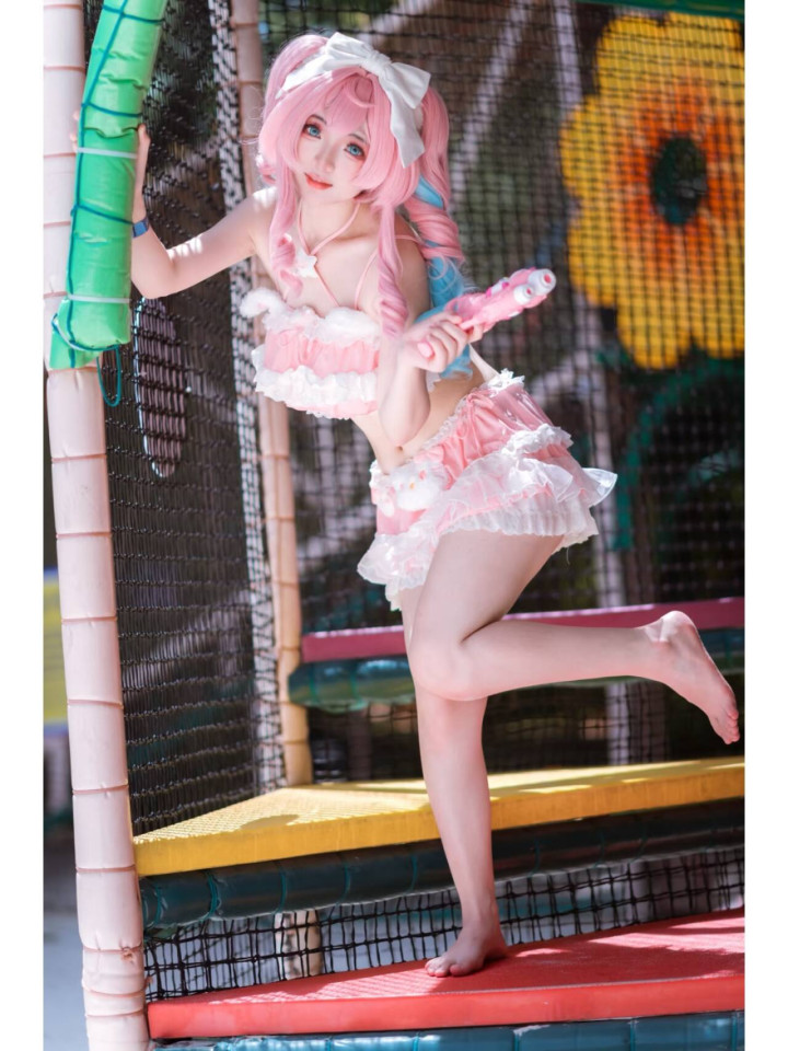 画面里,coser完美还原了风堇的造型。粉蓝渐变的双马尾俏皮灵动,头顶的白色大蝴蝶结更添甜美元气,仿佛随时会随着风堇的动作轻轻晃动。身上的粉白泳装,蕾丝与蓬松的裙摆设计,将风堇的可爱与娇俏展现得淋漓尽致,每一处细节都精心雕琢,力求贴近角色本身的气质。